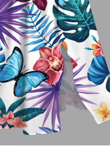 Plus Size Tropical Leaf Hibiscus Flower Branch Print Hawaii Split Pocket A Line Midi Dress - White - 6x