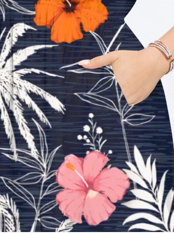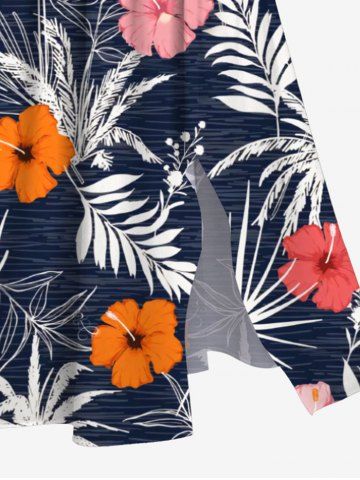 Plus Size Tropical Leaf Hibiscus Flower Coconut Tree Print Split Hawaii Midi Dress - Black - M