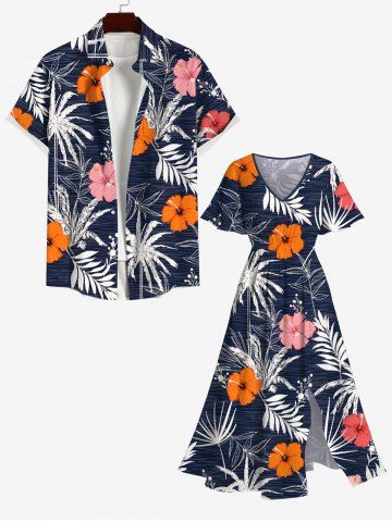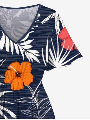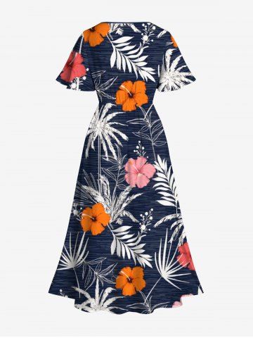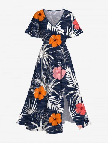 Graphic Dresses > Plus Size Tropical Leaf Hibiscus Flower Coconut Tree Print Split Hawaii Midi Dress