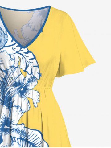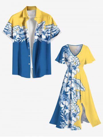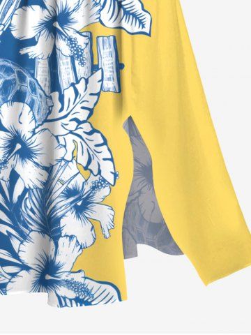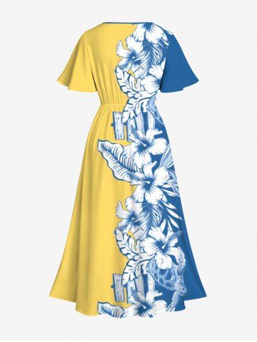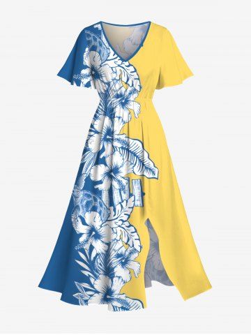 Graphic Dresses > Plus Size Tropical Leaf Hibiscus Flower Colorblock Turtle Print Split Hawaii Midi Dress