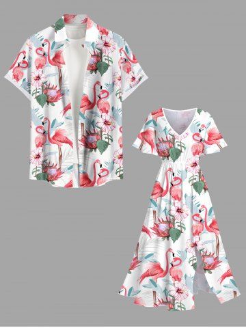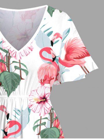Plus Size Tropical Leaf Hibiscus Flower Flamingo Print Hawaii Split Pocket A Line Midi Dress - White - S