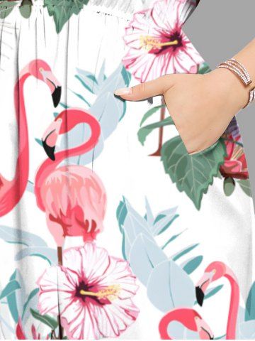 Plus Size Tropical Leaf Hibiscus Flower Flamingo Print Hawaii Split Pocket A Line Midi Dress - White - M
