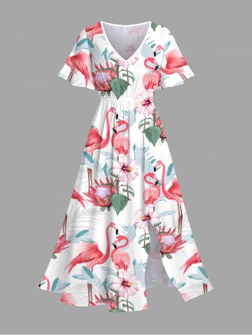 Plus Size Tropical Leaf Hibiscus Flower Flamingo Print Hawaii Split Pocket A Line Midi Dress - White - 3x