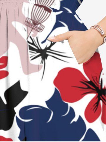 Plus Size Tropical Leaf Hibiscus Flower Gorilla Print Hawaii Split Pocket A Line Midi Dress - White - 3x