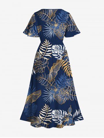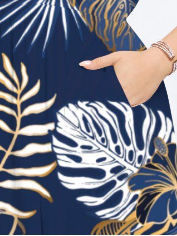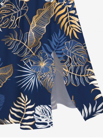 Plus Size Tropical Leaf Hibiscus Flower Metallic Print Split Hawaii Midi Dress - Multi-a - L