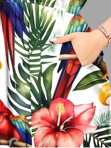 Plus Size Tropical Leaf Hibiscus Flower Parrot Print Hawaii Split Pocket A Line Midi Dress - White - Xxs