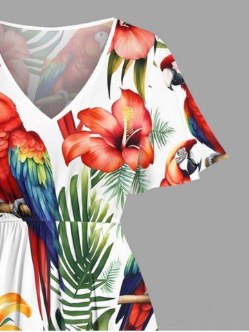 Plus Size Tropical Leaf Hibiscus Flower Parrot Print Hawaii Split Pocket A Line Midi Dress - White - 1x