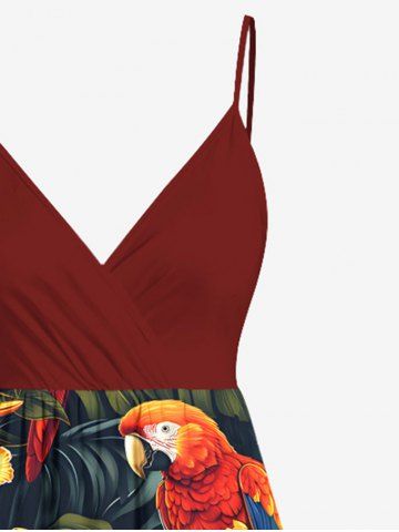 Plus Size Tropical Leaf Hibiscus Flower Parrot Print Hawaii Surplice A Line Cami Dress - Red - 4x