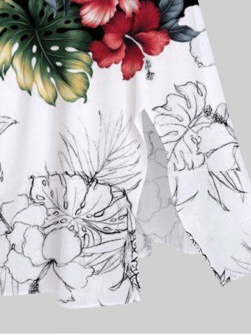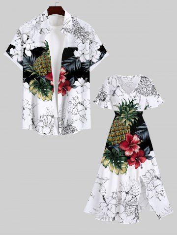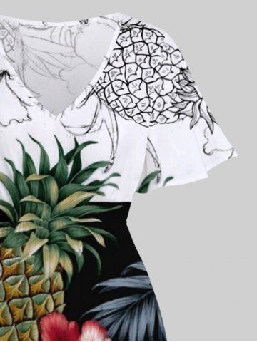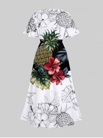Plus Size Tropical Leaf Hibiscus Flower Pineapple Print Split Hawaii Midi Dress - White - 4x
