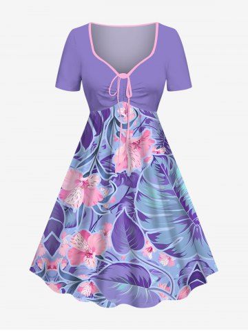 Plus Size Tropical Leaf Hibiscus Flower Print Cinched Hawaii Dress - Purple - 1x