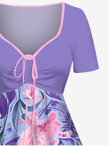 Plus Size Tropical Leaf Hibiscus Flower Print Cinched Hawaii Dress - Purple - 3x