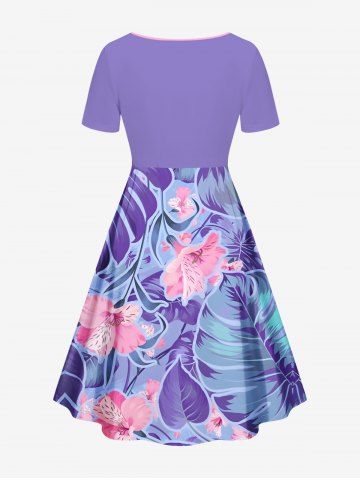 Plus Size Tropical Leaf Hibiscus Flower Print Cinched Hawaii Dress - Purple - 6x