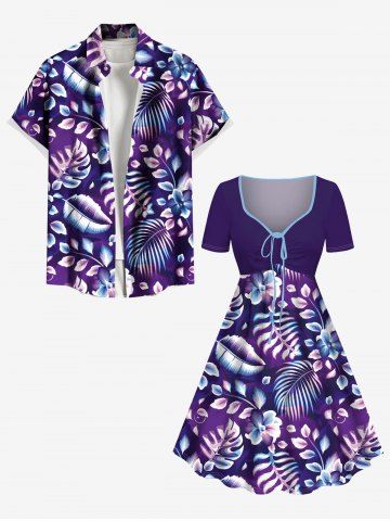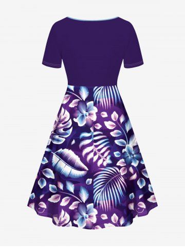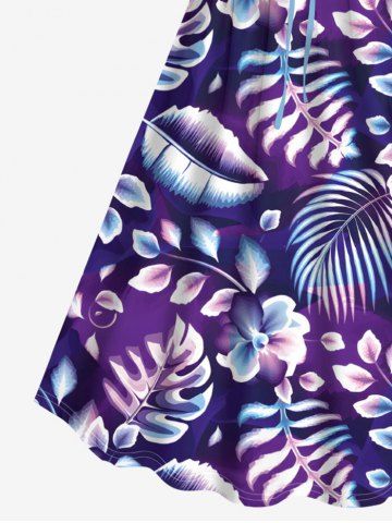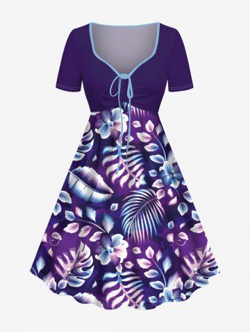Plus Size Tropical Leaf Hibiscus Flower Print Cinched Hawaii Dress - Purple - 2x