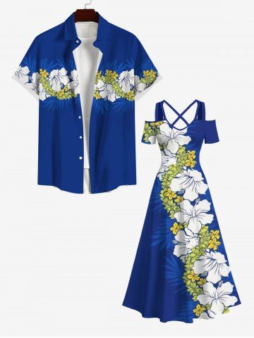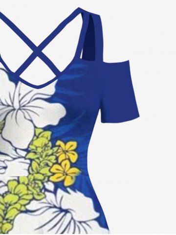 Plus Size Tropical Leaf Hibiscus Flower Print Cold Shoulder Crisscross Hawaii Maxi Dress - Blue - 2x