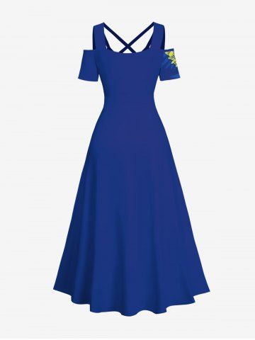 Plus Size Tropical Leaf Hibiscus Flower Print Cold Shoulder Crisscross Hawaii Maxi Dress - Blue - 3x