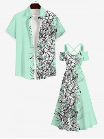 Plus Size Tropical Leaf Hibiscus Flower Print Cold Shoulder Crisscross Hawaii Maxi Dress - Green - 2x