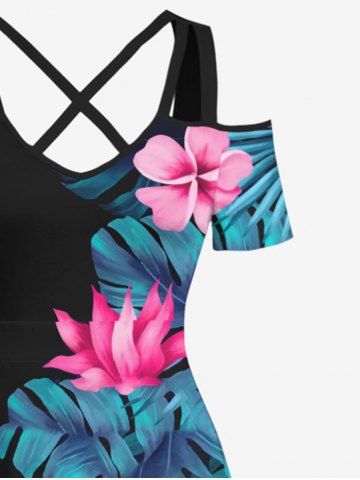 Plus Size Tropical Leaf Hibiscus Flower Print Cold Shoulder Crisscross Hawaii Maxi Dress - Black - Xs