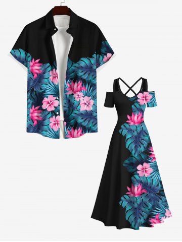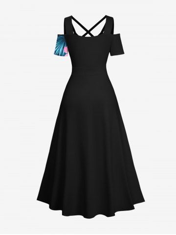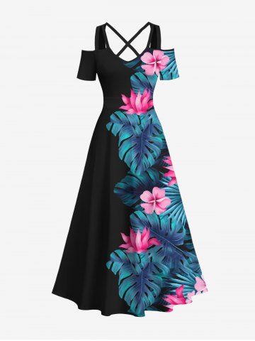 Plus Size Tropical Leaf Hibiscus Flower Print Cold Shoulder Crisscross Hawaii Maxi Dress - Black - S