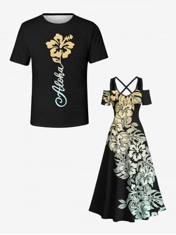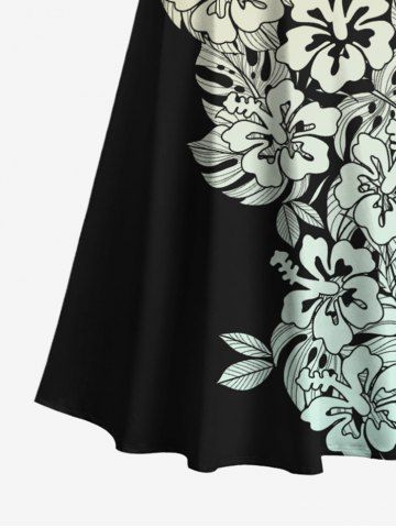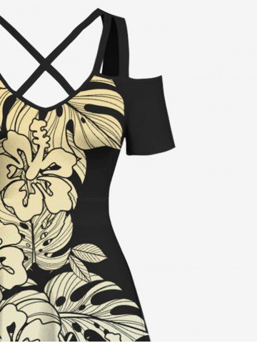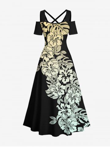 Plus Size Tropical Leaf Hibiscus Flower Print Cold Shoulder Crisscross Hawaii Maxi Dress - Black - 6x