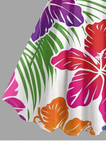 Plus Size Tropical Leaf Hibiscus Flower Print Hawaii A Line Dress - White - 1x