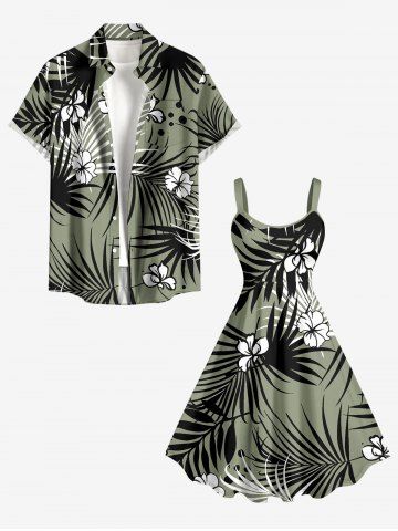 Plus Size Tropical Leaf Hibiscus Flower Print Hawaii A Line Dress - Light Green - Xs