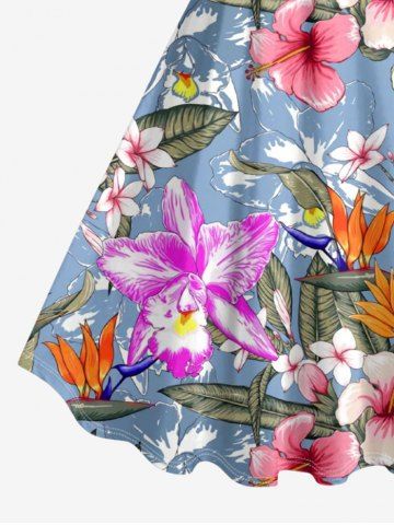 Plus Size Tropical Leaf Hibiscus Flower Print Hawaii A Line Dress - Powder Blue - 5x