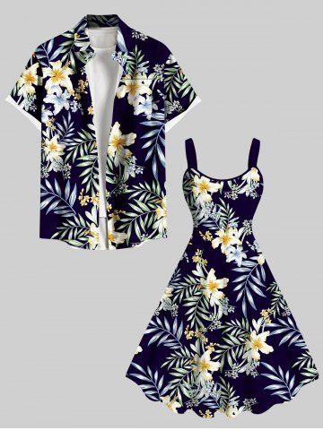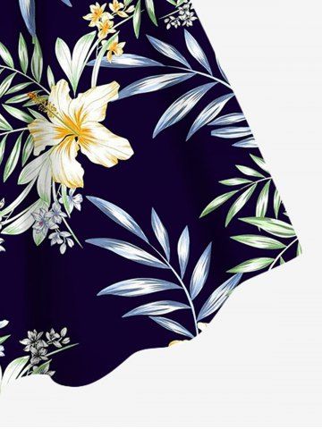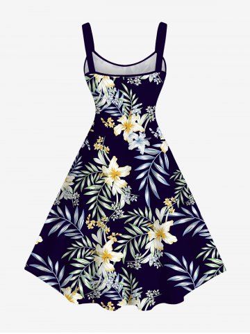 Plus Size Tropical Leaf Hibiscus Flower Print Hawaii A Line Tank Dress - Deep Blue - 3x