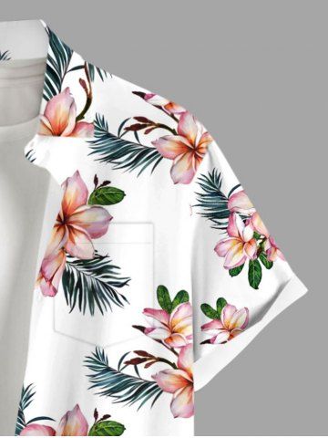 Plus Size Tropical Leaf Hibiscus Flower Print Hawaii Button Pocket Shirt For Men - White - S
