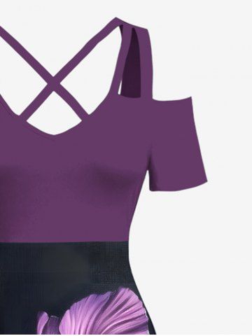 Plus Size Tropical Leaf Hibiscus Flower Print Hawaii Cold Shoulder Crisscross A Line Maxi Dress - Purple - Xxs