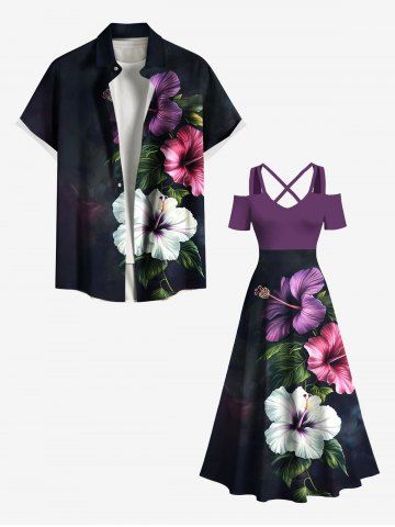 Plus Size Tropical Leaf Hibiscus Flower Print Hawaii Cold Shoulder Crisscross A Line Maxi Dress - Purple - 6x