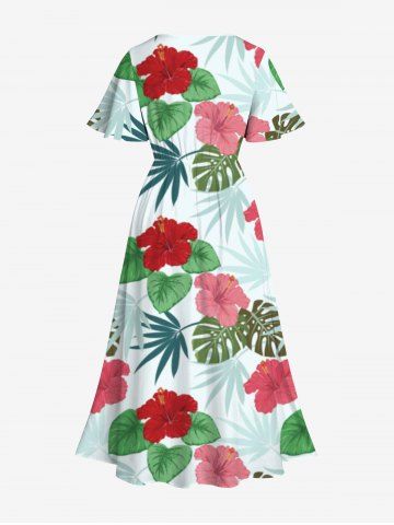 Plus Size Tropical Leaf Hibiscus Flower Print Hawaii Pocket Split A Line Midi Dress - White - Xxs