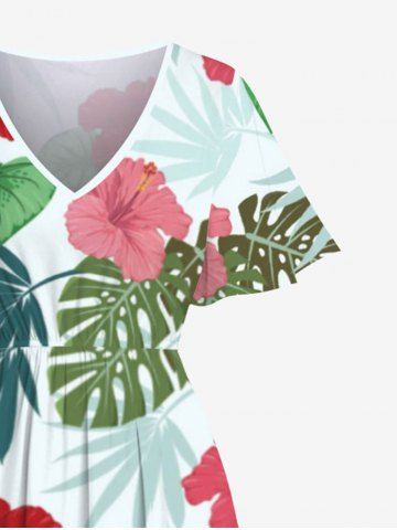 Plus Size Tropical Leaf Hibiscus Flower Print Hawaii Pocket Split A Line Midi Dress - White - M