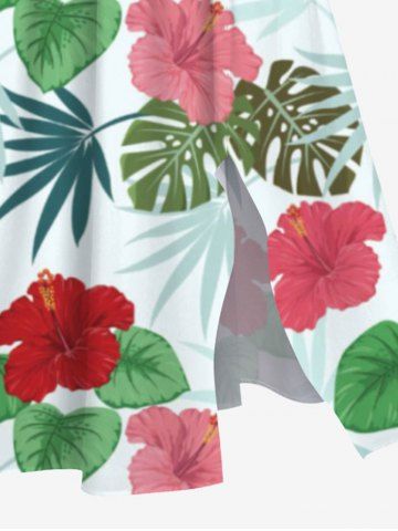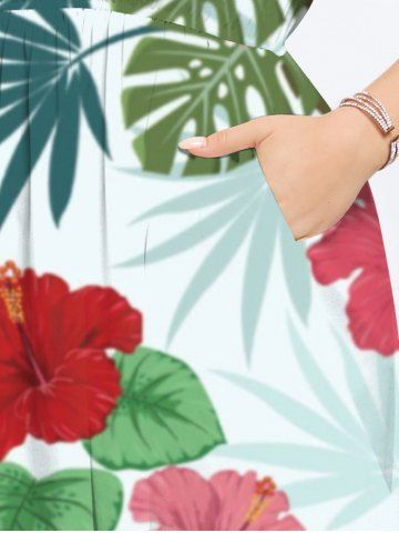Plus Size Tropical Leaf Hibiscus Flower Print Hawaii Pocket Split A Line Midi Dress - White - 2x