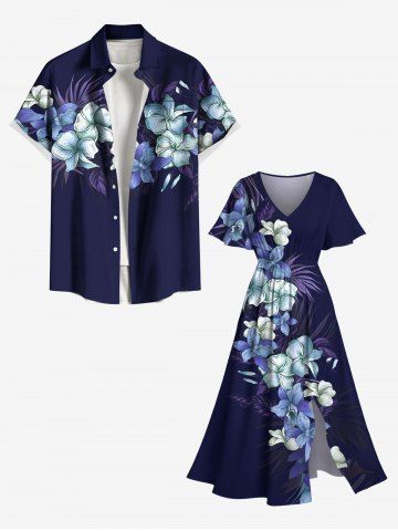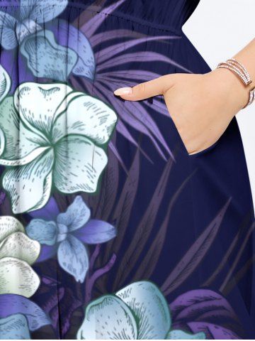 Plus Size Tropical Leaf Hibiscus Flower Print Hawaii Split Pocket A Line Midi Dress - Deep Blue - 4x