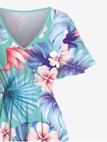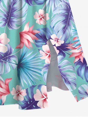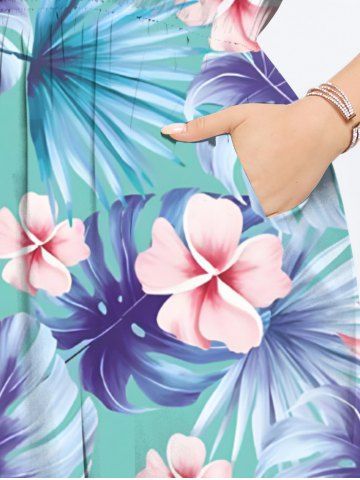 Plus Size Tropical Leaf Hibiscus Flower Print Hawaii Split Pocket A Line Midi Dress - Light Green - 2x
