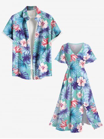 Graphic Dresses > Plus Size Tropical Leaf Hibiscus Flower Print Hawaii Split Pocket A Line Midi Dress