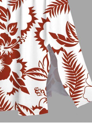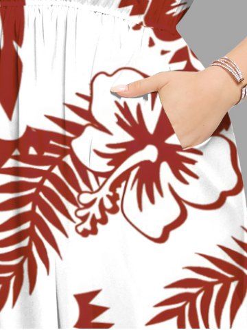 Plus Size Tropical Leaf Hibiscus Flower Print Hawaii Split Pocket A Line Midi Dress - White - 1x