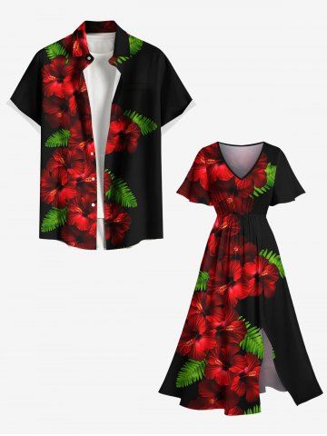 Plus Size Tropical Leaf Hibiscus Flower Print Hawaii Split Pocket A Line Midi Dress - Red - Xxs