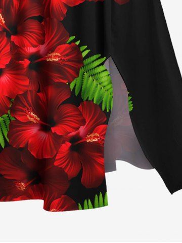 Plus Size Tropical Leaf Hibiscus Flower Print Hawaii Split Pocket A Line Midi Dress - Red - 2x