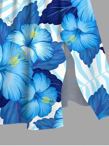 Plus Size Tropical Leaf Hibiscus Flower Print Hawaii Split Pocket A Line Midi Dress - Blue - Xxs