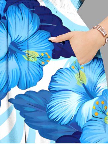 Plus Size Tropical Leaf Hibiscus Flower Print Hawaii Split Pocket A Line Midi Dress - Blue - L