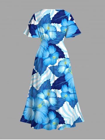 Plus Size Tropical Leaf Hibiscus Flower Print Hawaii Split Pocket A Line Midi Dress - Blue - 6x