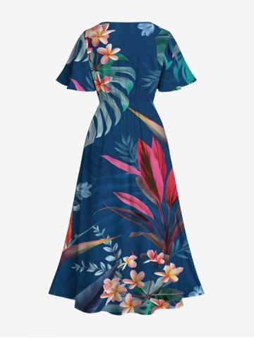 Plus Size Tropical Leaf Hibiscus Flower Print Hawaii Split Pocket A Line Midi Dress - Blue - S