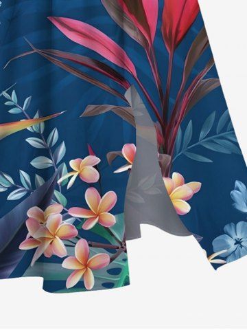 Plus Size Tropical Leaf Hibiscus Flower Print Hawaii Split Pocket A Line Midi Dress - Blue - M