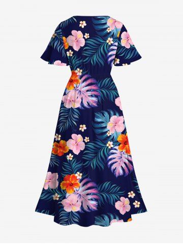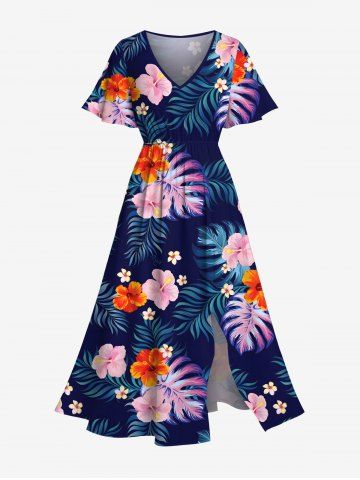 Plus Size Tropical Leaf Hibiscus Flower Print Hawaii Split Pocket A Line Midi Dress - Deep Blue - 5x