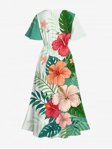 Plus Size Tropical Leaf Hibiscus Flower Print Hawaii Split Pocket A Line Midi Dress - Green - Xxs