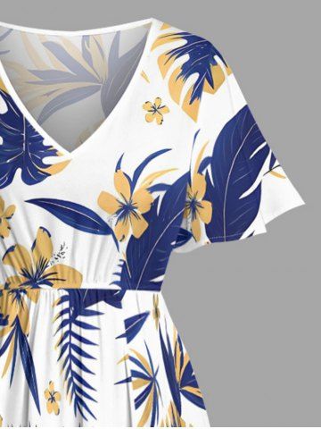 Plus Size Tropical Leaf Hibiscus Flower Print Hawaii Split Pocket A Line Midi Dress - White - Xxs