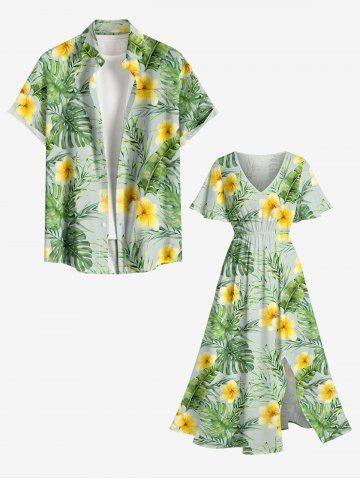 Plus Size Tropical Leaf Hibiscus Flower Print Hawaii Split Pocket A Line Midi Dress - Green - S