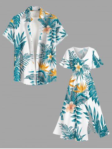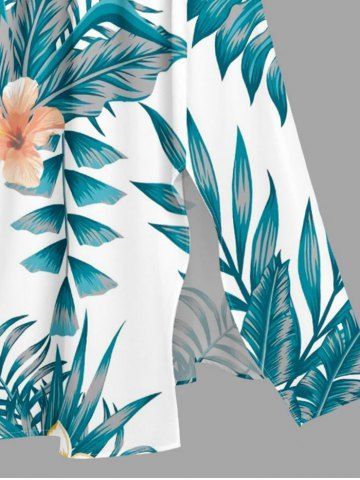 Plus Size Tropical Leaf Hibiscus Flower Print Hawaii Split Pocket A Line Midi Dress - Dark Turquoise - S