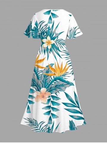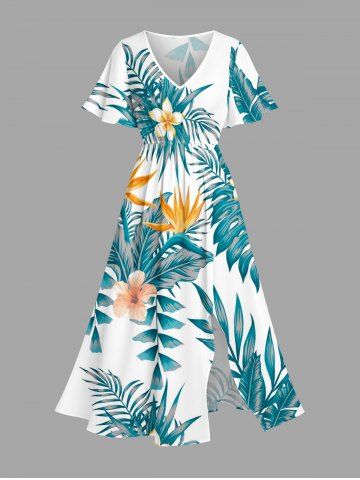 Graphic Dresses > Plus Size Tropical Leaf Hibiscus Flower Print Hawaii Split Pocket A Line Midi Dress
